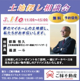 3月14日(土)11:00~15:00 オークラランド住宅公園(世田谷区桜3-24-8)にて 夢のマイホームの土地探し、私たちがお手伝いします。 土地探しのコツ・ポイントをご説明。一緒にデータベースを見ながら 土地探しの […]
