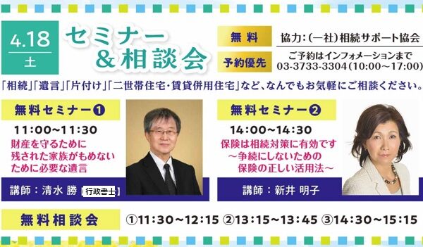 2026年4月18日「相続」「遺言」セミナー&相談会を 大田区 環八蒲田住宅公園(大田区新蒲田1-12)にて開催します。 予約は、環八蒲田住宅公園 インフォメーションまで 03-3733-3304(10:00~17:00 […]